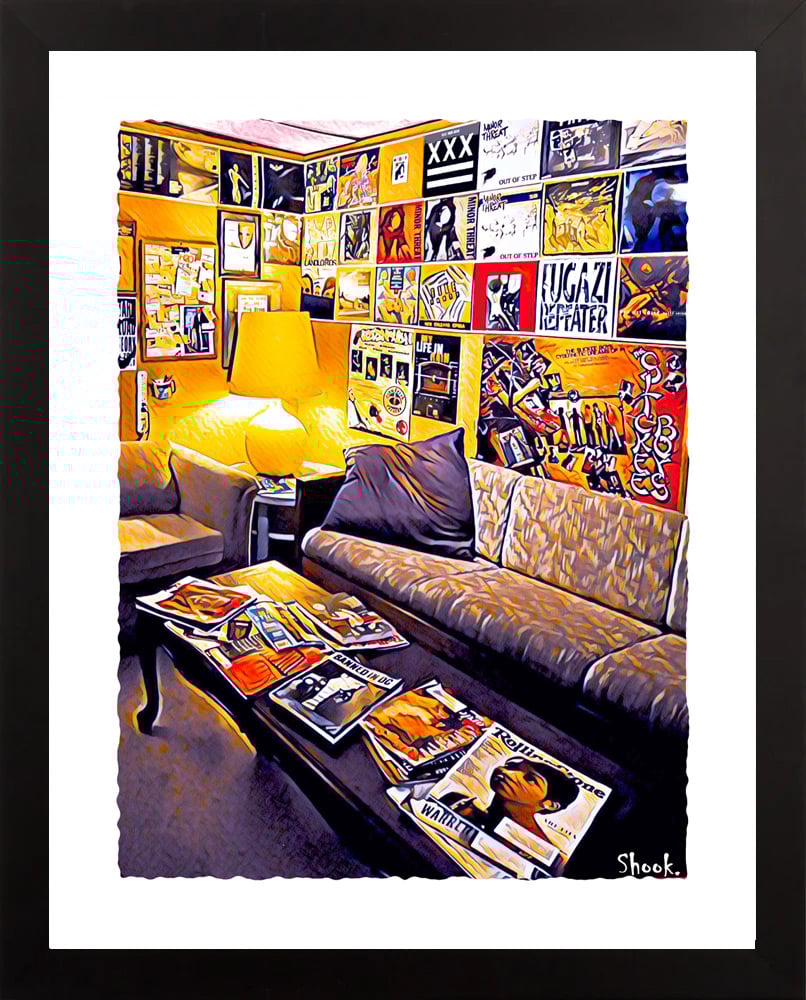 I was one of the many lucky ones who got to record there. My old band, Ape House, was making an album at the same time Ian MacKaye was in the house producing a Q and Not U release. My later band, The Buzz, was interviewed for Don and Alex Vidales' "StageCraft" radio show in the fall of 2018 (pics of me and my family from this day are here for all to see). The place was imbued in goodness, and for this reason I am commemorating it with a couple of prints that sum up the way I want to remember it.